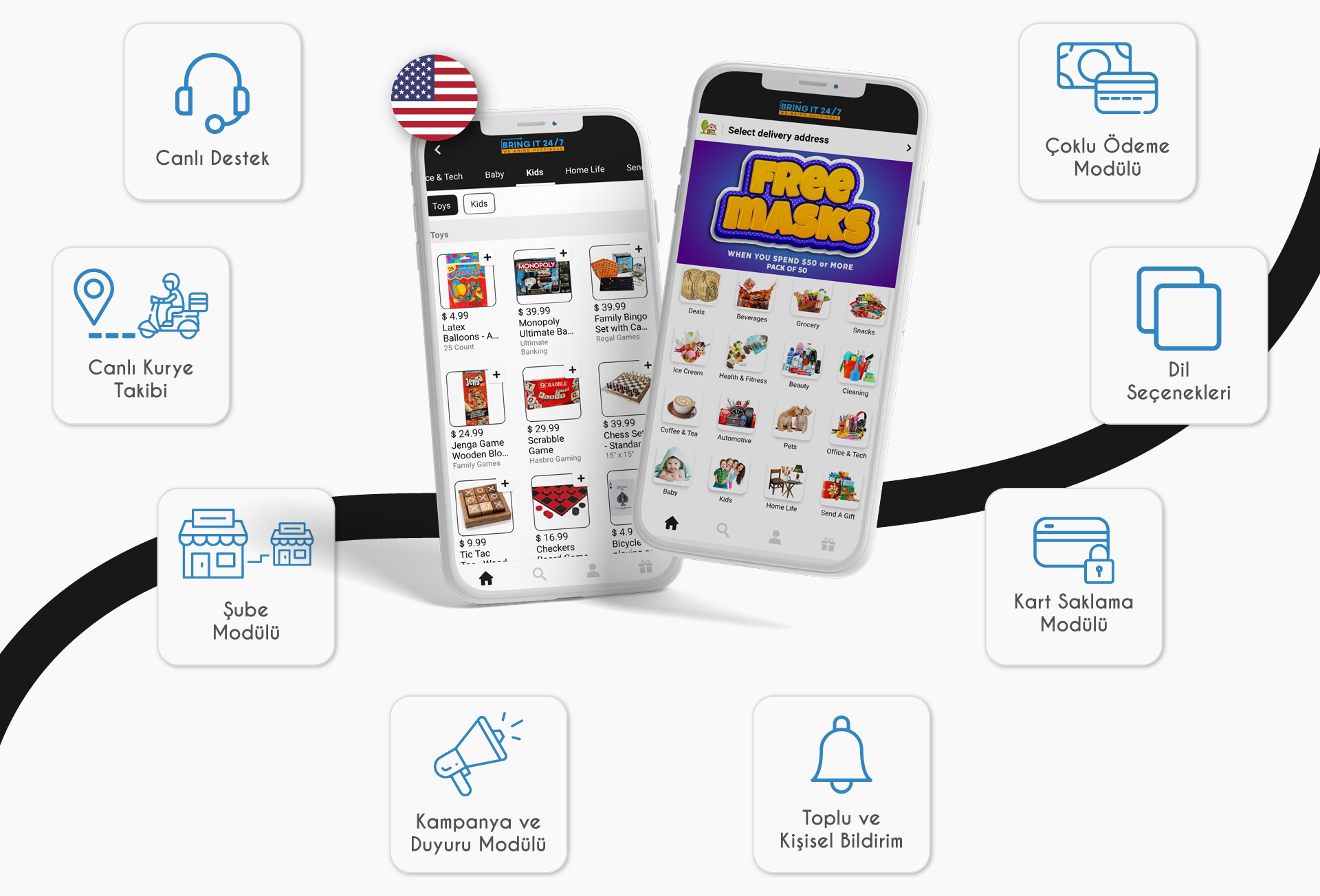 “Bring-it” Sanal market, alt yapımızı kullanan bir diğer firmadır. Canlı kurye takibi, online ödeme, şube ve dil seçenekleri, gelişmiş admin paneli seçenekleri ile geliştirmeye ve yeni modüller eklemeye devam ediyoruz. Sektörün en gelişmiş uygulamalarından biri desek yanılmayız.