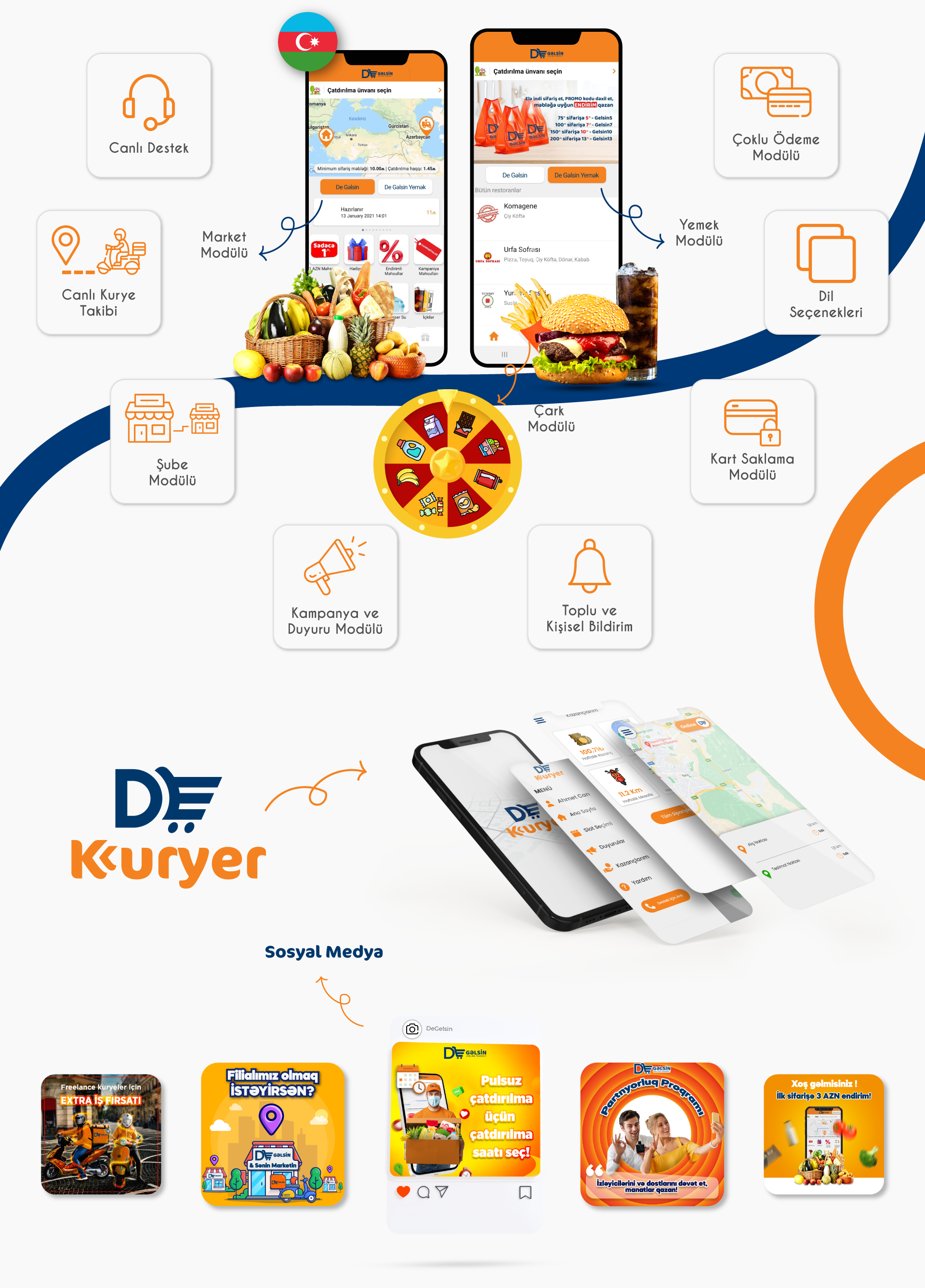 “De Gelsin” Sanal market, alt yapımızı kullanan bir diğer firmadır. Canlı kurye takibi, online ödeme, şube ve dil seçenekleri, gelişmiş admin paneli seçenekleri ile geliştirmeye ve yeni modüller eklemeye devam ediyoruz. Sektörün en gelişmiş uygulamalarından biri desek yanılmayız.