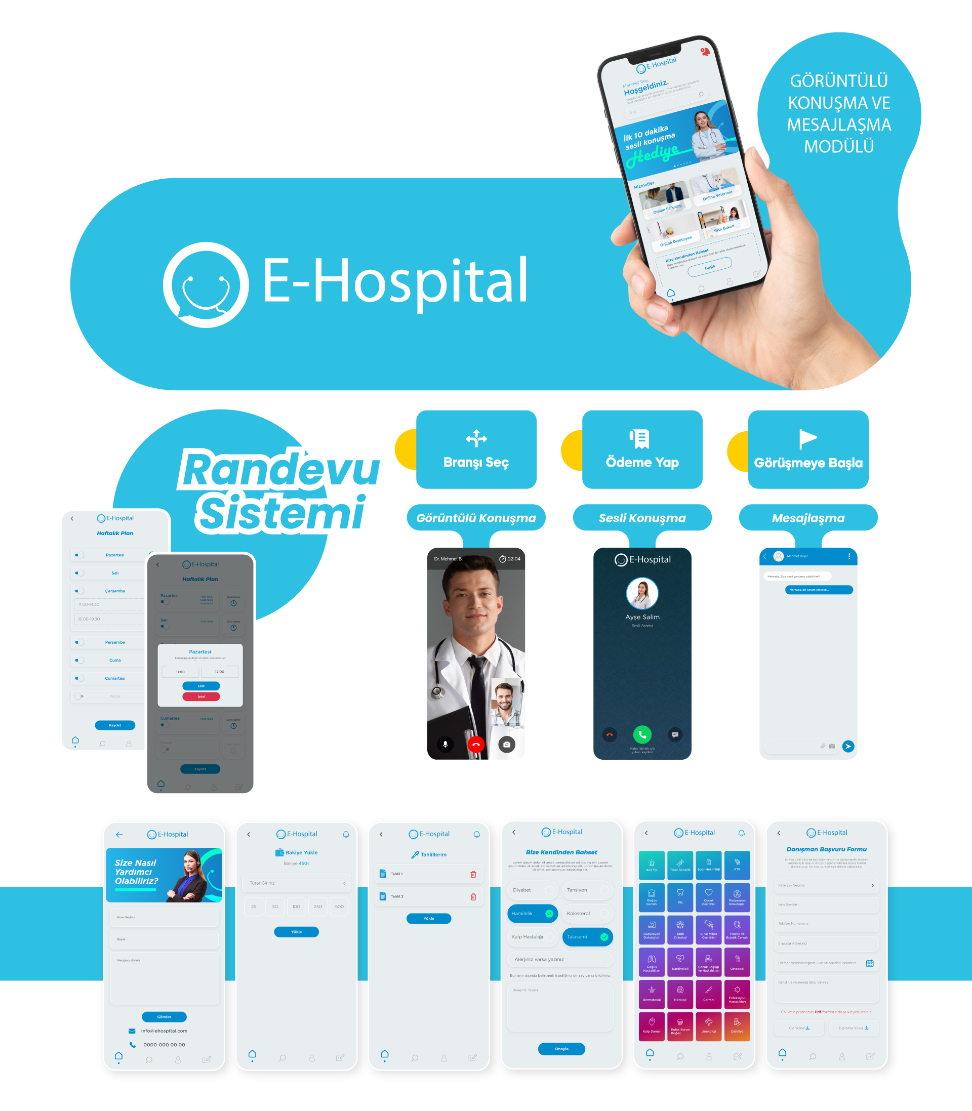 E-Hospital, sağlık hizmetlerine erişimi kolaylaştırmak amacıyla geliştirilmiş bir online hastane uygulamasıdır. Firmamız tarafından tasarlanan bu uygulama, kullanıcıların sağlık hizmetlerine hızlı ve güvenli bir şekilde ulaşmasını sağlıyor. Uygulama, randevu alma, doktorlarla online görüşme, sağlık geçmişini takip etme ve tıbbi bilgilere erişim gibi birçok hizmet sunarak kullanıcı deneyimini zenginleştiriyor. E-Hospital ile sağlık ihtiyaçlarınızı evinizin konforunda karşılayabilir, zaman kaybını önleyebilir ve sağlık yönetiminizi kolaylaştırabilirsiniz.